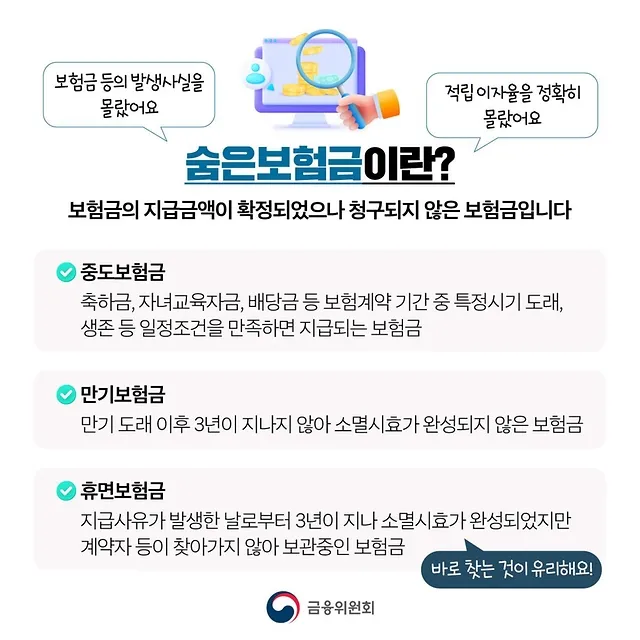 숨은보험금이란 보험금의 지급금액이 확정되었으나, 계약자가 청구하지 않아 지급되지 않은 보험금을 말합니다. 내가 보험에 가입했다는 사실 자체를 잊었거나, 보험금 발생 사실을 몰랐거나, 혹은 이자율을 정확히 몰라 찾아가지 않는 등 다양한 이유로 발생합니다.