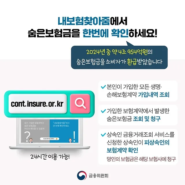 과거에는 내가 가입한 모든 보험을 확인하려면 각 보험사에 일일이 연락해야 했지만, 지금은 금융위원회와 보험업계가 공동으로 운영하는 '내보험찾아줌(cont.insure.or.kr)' 서비스를 통해 한 번에 확인할 수 있습니다. 실제로 2024년 한 해 동안 약 4조 954억 원의 숨은보험금이 이 서비스를 통해 주인을 찾아갔습니다.